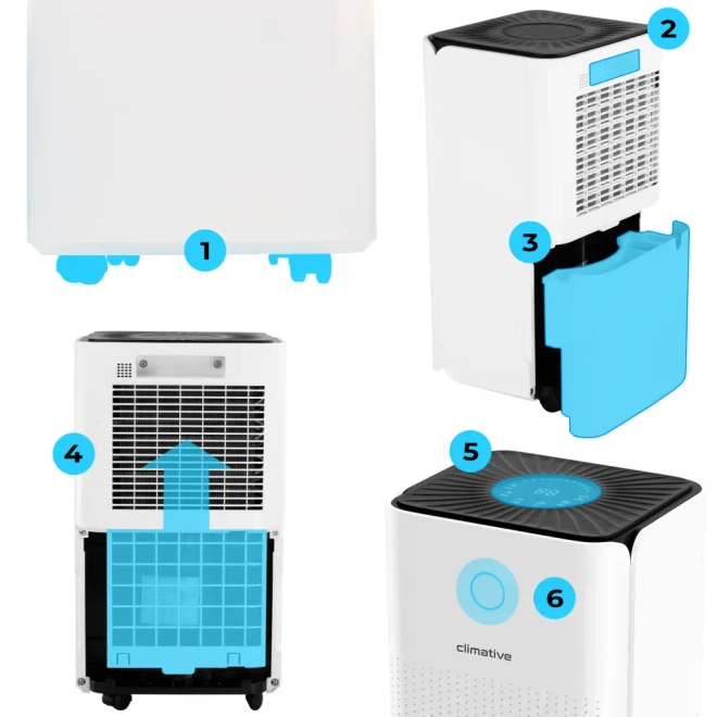 Osuszacz powietrza Climative Wave ION został wyposażony w zbiornik na wodę o pojemności 2,0 litra, co umożliwia wygodne użytkowanie urządzenia bez konieczności częstego opróżniania. Dzięki temu minimalizuje się ryzyko przerwania pracy osuszacza z powodu przepełnienia zbiornika. Zbiornik jest umieszczony w tylnej części urządzenia, a jego wyjmowanie i ponowne umieszczanie są bardzo proste i intuicyjne.