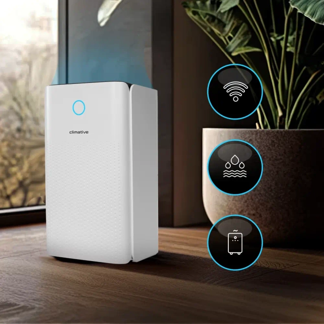 Climative DH-12S Wave ION to zaawansowany osuszacz powietrza z funkcją ciągłej pracy, idealny do suszenia prania. Urządzenie oferuje dwa sposoby odprowadzania wody: stałe przez rurkę lub do zbiornika. Wbudowana jonizacja usuwa alergeny i zanieczyszczenia z powietrza, poprawiając jego jakość. Sterowanie Wi-Fi umożliwia zdalne zarządzanie urządzeniem za pomocą aplikacji na smartfonie.