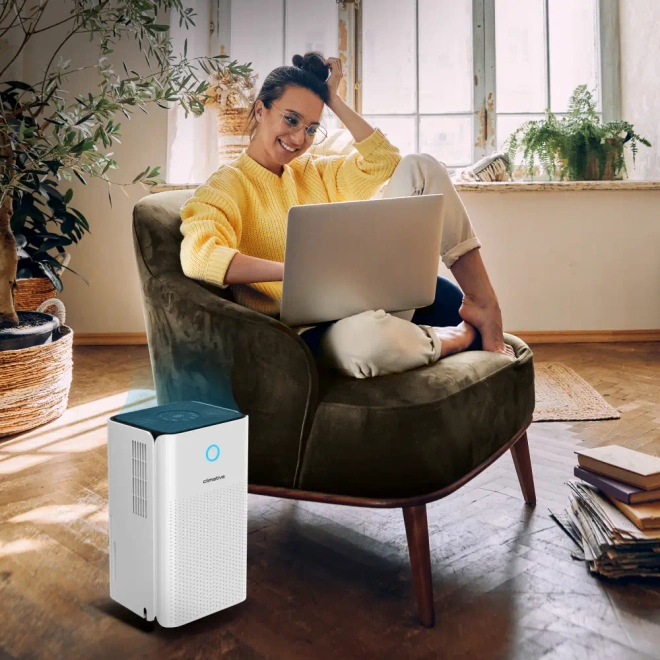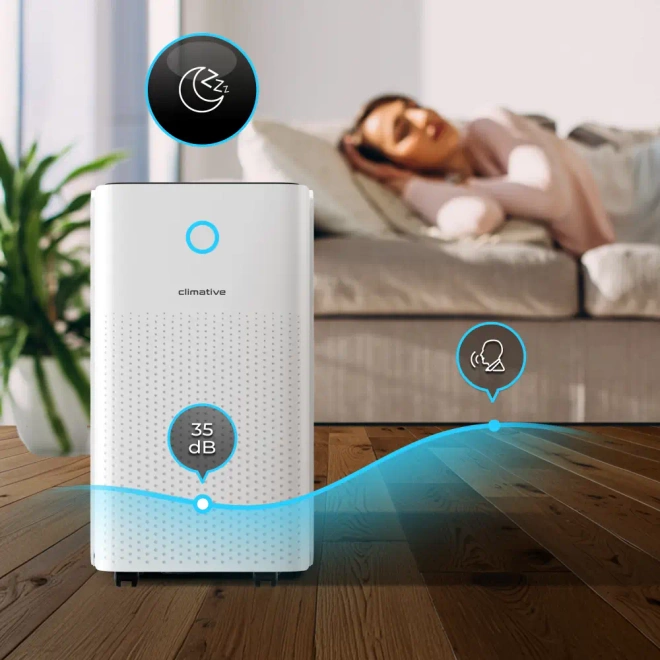 Dużym atutem osuszacza Climative Wave ION jest jego wyjątkowo cicha praca, nawet na najwyższych obrotach wentylatora. Osiągnięto to dzięki zastosowaniu nowoczesnej sprężarki, działającej na bazie nowego ekologicznego czynnika chłodniczego R290. Tryb snu zapewnia zdolność urządzenia do pracy w nocy bez zakłócania snu. Możesz umieścić go w sypialni, wiedząc, że nie będzie przeszkadzał w odpoczynku, co jest szczególnie ważne dla osób o lekkim śnie.