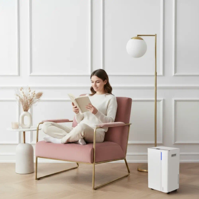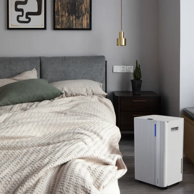 Zasypiaj w idealnych warunkach. Osuszacz dba o stabilny poziom wilgotności, a dzięki cichej pracy (≤ 41 dB) nie zakłóca snu.