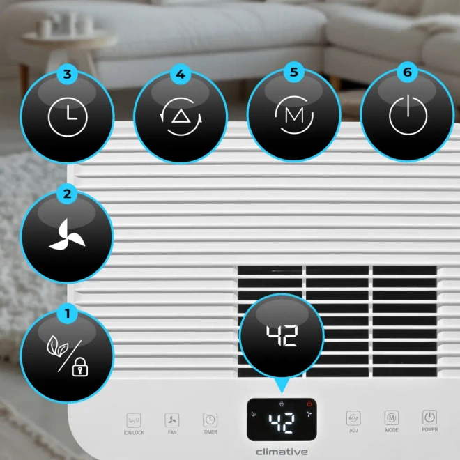 Osuszacz Climative Cube ION oferuje dwa proste sposoby sterowania: manualnie za pomocą panelu dotykowego oraz zdalnie przez aplikację.
