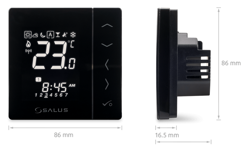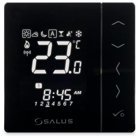 Podtynkowy regulator temperatury służący do bezprzewodowego sterowania urządzeniami z serii SALUS Smart Home, takimi jak: listwa centralna KL08RF, głowica TRV i moduł sterujący RX10RF.