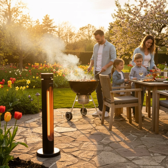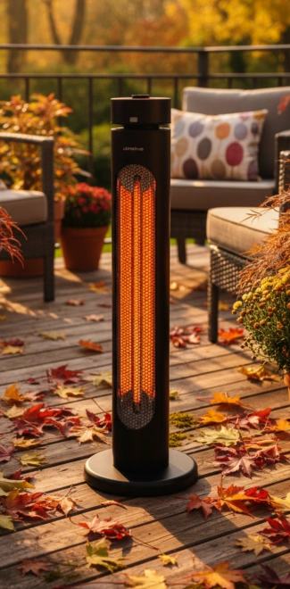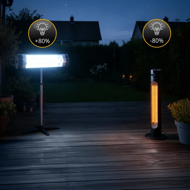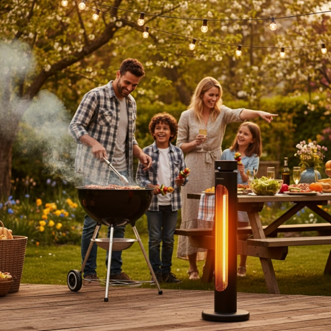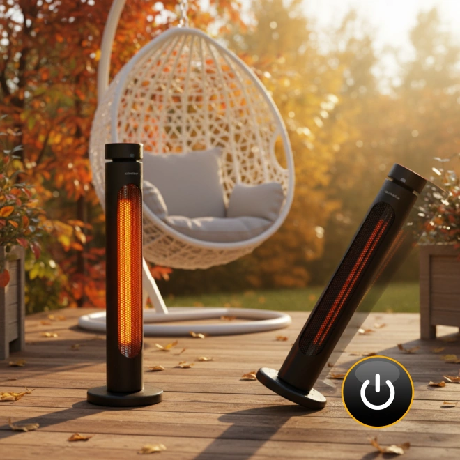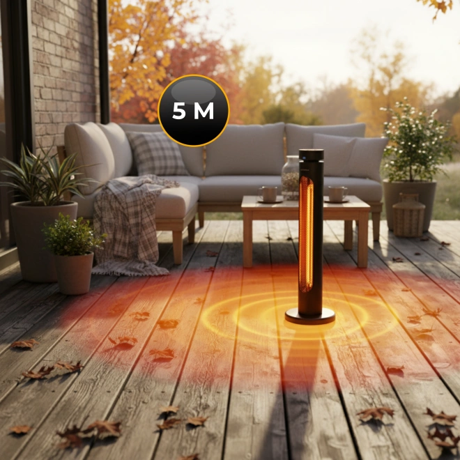 🟦 Ogrzewa duże przestrzenie – zapewnia przyjemne ciepło na tarasach, w altanach, na balkonach i w pomieszczeniach, nawet podczas chłodniejszych dni