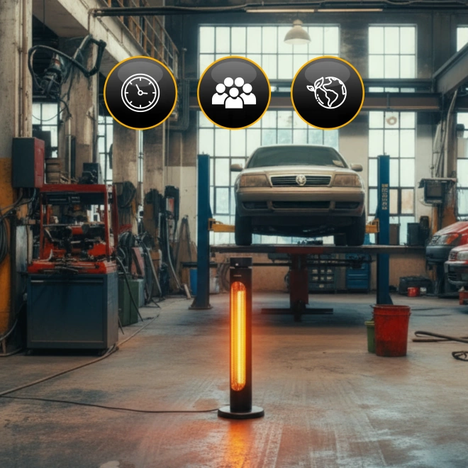 🟦 Energooszczędne ogrzewanie – technologia podczerwieni ogrzewa bezpośrednio osoby i przedmioty, eliminując straty energii na podgrzewanie powietrza