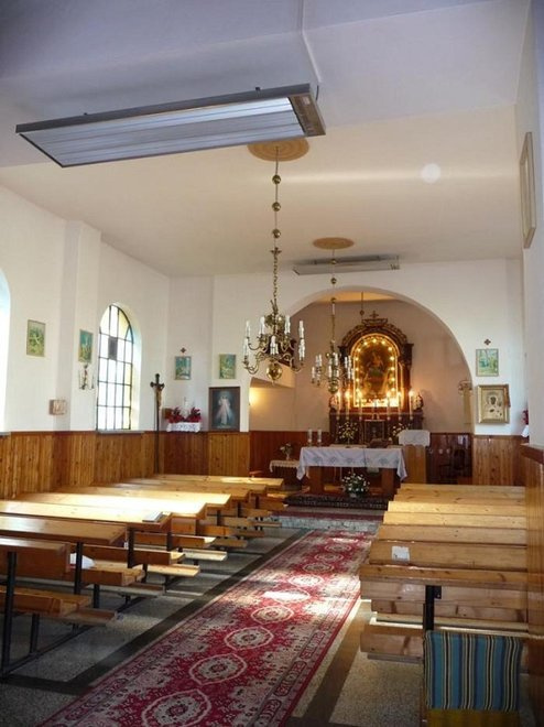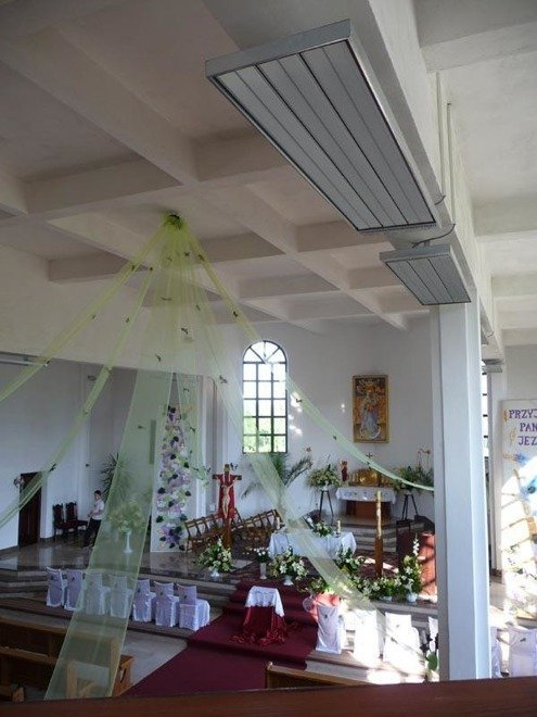 Kościoły są dość specyficznymi obiektami. Obiekty tego typu nigdy nie były przystosowane do jakiegokolwiek typu ogrzewania, tym bardziej konwekcyjnego. Charakteryzują się dość znacznym stosunkiem wysokości do powierzchni, przez co ogrzane konwekcyjnie powietrze grawitacyjnie unosi się w wyższe partie kościoła. Jedynym efektywnym sposobem rozwiązania tego problemu jest ogrzewanie bezpośrednie promiennikowe ECOSUN. Promienniki te mogą być wykonane w dowolnym kolorze, tak aby się komponowały z wewnętrzną architekturą kościoła. Promienniki te mogą również być wkomponowane w żyrandole. Innym sposobem ogrzewania kościołów jest zastosowanie promienników niskotemperaturowych ECOSUN 130 W lub ECOSUN 325 W w umieszczonych pod siedziskami ław lub nad klęcznikami. W tym wypadku do uzyskania tego samego efektu co przy promiennikach wysokotemperaturowych można zaangażować mniejszą moc. Promiennikami niskotemperaturowymi ogrzewamy także strefowo takie miejsca jak prezbiterium, konfesjonały, chór (organistę), zakrystię oraz inne pomieszczenia. Stosując ogrzewanie promiennikowe sterowane programatorami tygodniowo-dobowymi możemy ogrzewać w określonych porach dnia np. w czasie trwania Mszy Św. co dodatkowo zmniejsza koszty ogrzewania.