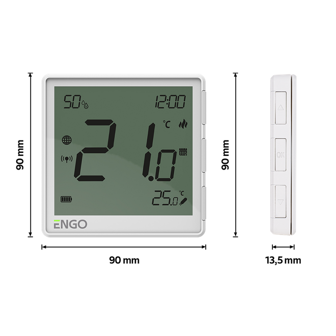 Zakres regulacji temperatury wynosi od 5 do 45°C, a funkcja ENGO binding pozwala na bezpośrednie połączenie z listwami i modułami sterującymi. Dzięki temu regulator działa niezawodnie zarówno online, jak i offline. Użytkownik może monitorować historię pomiarów temperatury, ustawiać powiadomienia push oraz dostosować podświetlenie wyświetlacza, zapewniając pełną kontrolę nad systemem.
