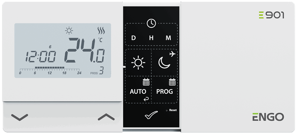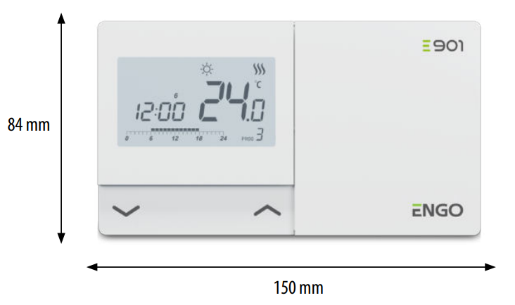 ENGO E901 to natynkowy, tygodniowy regulator pokojowy, służący do przewodowego sterowania urządzeniami oraz systemami grzewczymi lub chłodzącymi. Jego działanie polega na utrzymywaniu komfortowych warunków w pomieszczeniu, zgodnie z harmonogramami pracy lub nastawioną przez użytkownika stałą temperaturą. Podłącza się go bezpośrednio do urządzenia grzewczego.