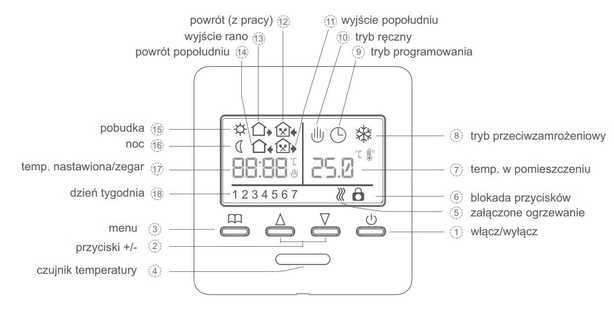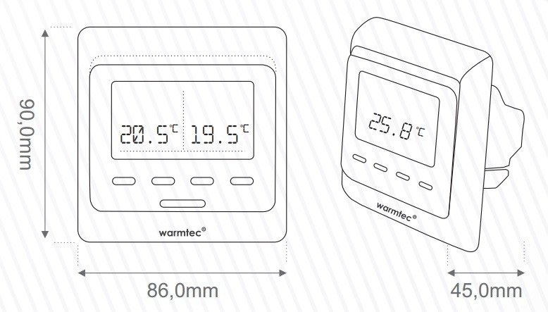 Programowalny regulator temperatury Warmtec T510 wyposażony jest w duży, czytelny wyświetlacz LCD o wyraźnym, jasnym podświetleniu. Urządzenie może pracować w jednym z dwóch dostępnych trybów (grzanie/chłodzenie). Do wyboru są następujące programy: manualny, programowalny lub przeciwzamarzaniowy. Ponadto, urządzenie umożliwia regulację załączania grzania/chłodzenia w zakresie od 0,5 do 10°C (histereza). W razie nagłego braku prądu, regulator posiada 24-godzinne podtrzymanie pamięci.