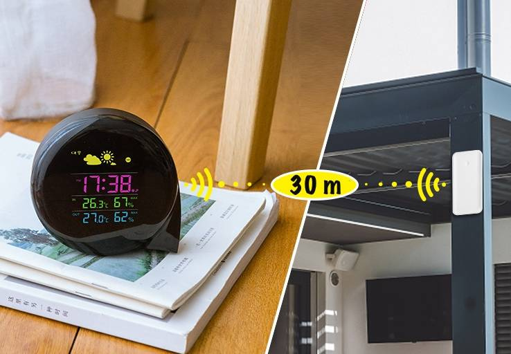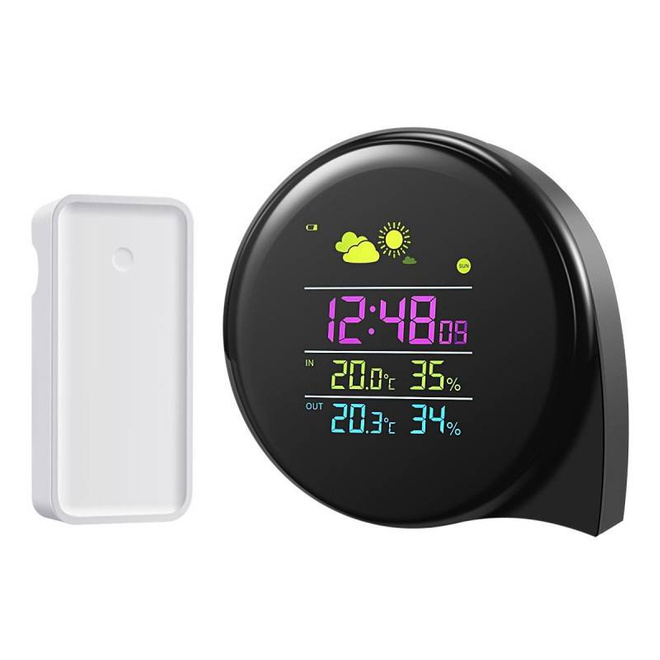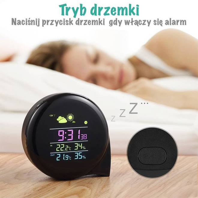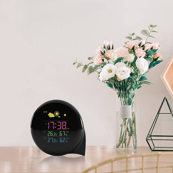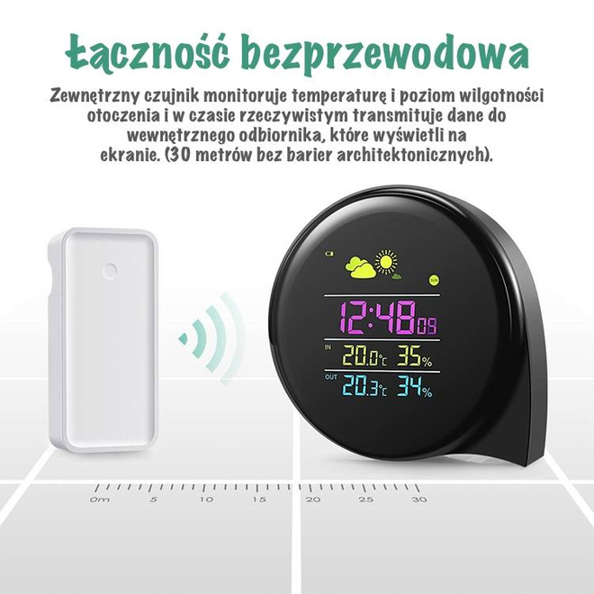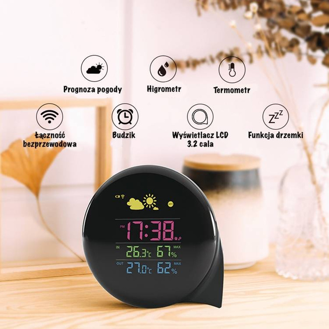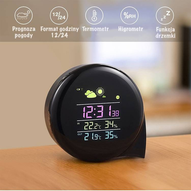 Stacja pogodowa HAPTIME o pięknym okrągłym kształcie pozwala na bieżąco monitorować wilgotność i temperaturę powietrza na zewnątrz oraz wewnątrz pomieszczenia. Stacje umożliwia również śledzenie prognozy pogody. Prezentacja pogody i czasu oraz temperatury i wilgotności na zewnątrz i wewnątrz pomieszczenia.