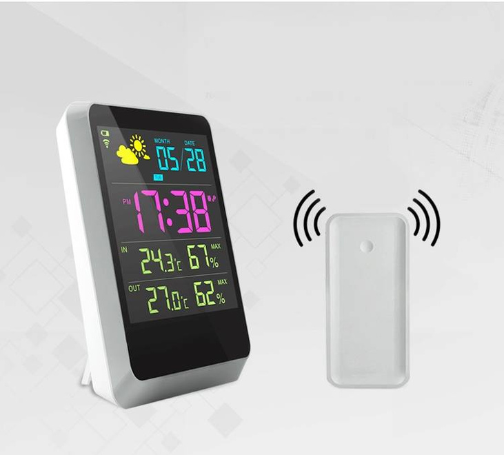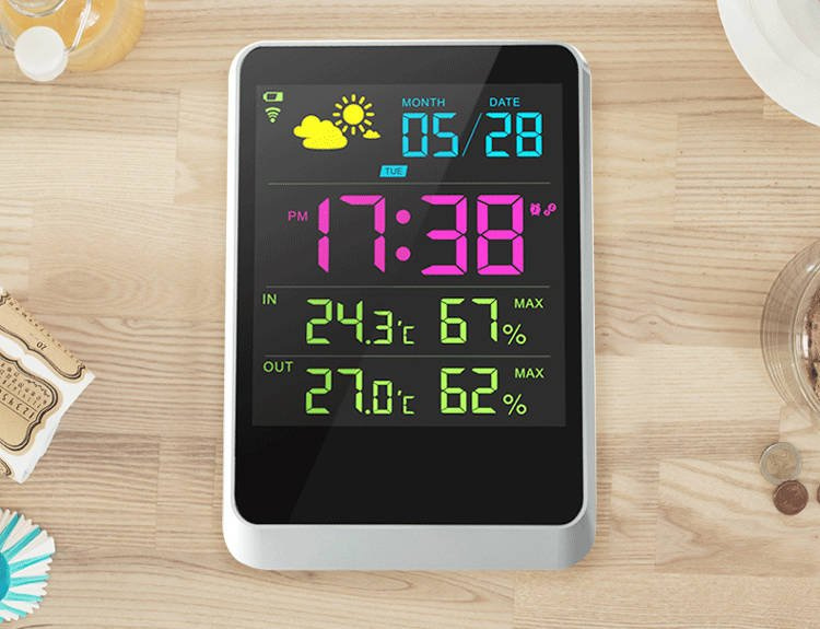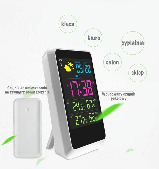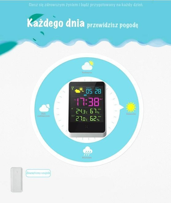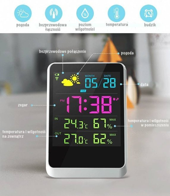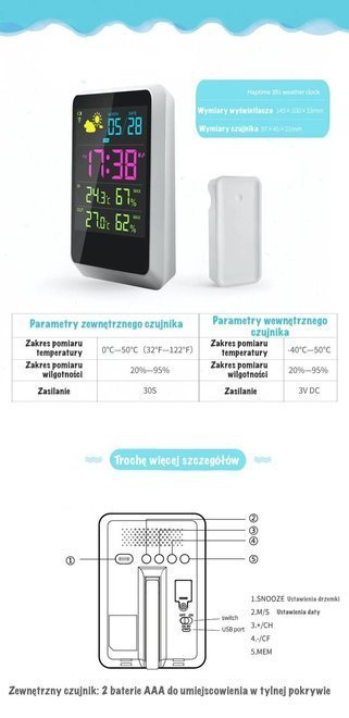 Stacja pogodowa HAPTIME o klasycznym prostokątnym kształcie w kolorze białym, pozwala na bieżąco monitorować wilgotność i temperaturę powietrza na zewnątrz oraz wewnątrz pomieszczenia. Stacje umożliwia również śledzenie prognozy pogody. Prezentacja pogody i czasu oraz temperatury i wilgotności na zewnątrz i wewnątrz pomieszczenia.