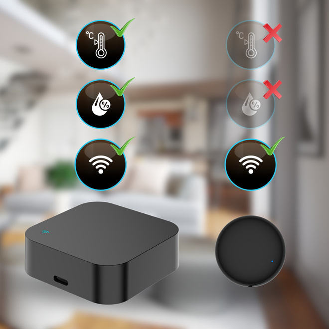• Wbudowany czujnik temperatury i wilgotności – bieżące odczyty i alerty w aplikacji