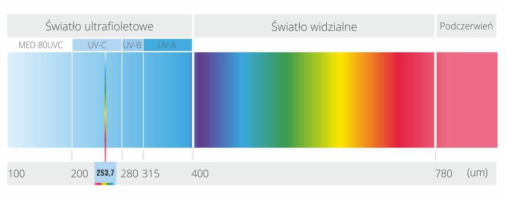 Sterylizator MED-80UVC używa najbardziej efektywnego promieniowania światła UV-C, o długości fali 253,7 nm. Udowodniono że właśnie ta wartość światła UV-C skutecznie dezynfekuje , grzyby, wirusy oraz bakterie znajdujące się w otaczającym nas powietrzu.