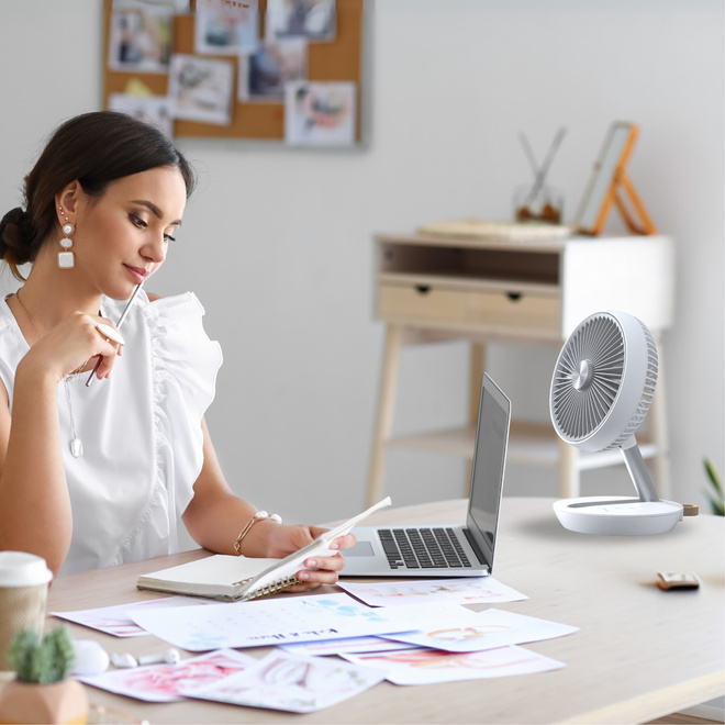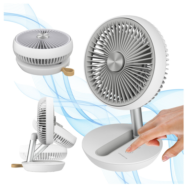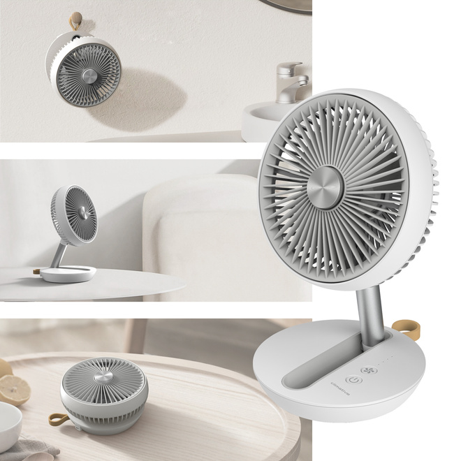 Obracana głowica o zakresie 180° umożliwia precyzyjne ustawienie kierunku nawiewu – niezależnie od tego, czy pracujesz, odpoczywasz czy zasypiasz. Składana konstrukcja pozwala dowolnie konfigurować ustawienie wentylatora: na nisko położonym blacie, wyżej na półce, a nawet w wersji wiszącej.