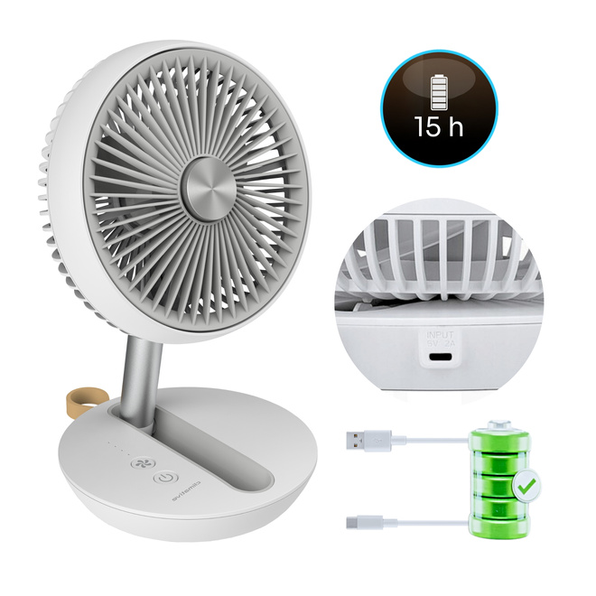 Wentylator został zaprojektowany z myślą o użytkownikach, którzy cenią jakość, stabilność i wydajność. Większa średnica śmigła zapewnia mocniejszy i skuteczniejszy nawiew, a stabilna konstrukcja eliminuje wszelkie drgania i nieprzyjemne dźwięki. Solidne wykonanie, dobrze spasowane elementy oraz trwałe materiały gwarantują niezawodność nawet przy intensywnym użytkowaniu. Bezszczotkowy silnik DC pracuje cicho, jest energooszczędny i oferuje długi czas działania – do 15 godzin w trybie cichym. Ładowanie przez USB-C jest szybkie i wygodne, a dołączony kabel sprawia, że od razu masz wszystko, co potrzebne.