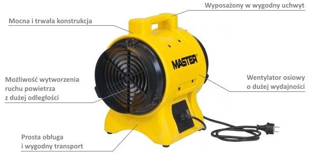 Przenośne wentylatory Master wspomagają działanie urządzeń osuszających, grzewczych i chłodzących. Mogą być stosowane w pomieszczeniach zarówno w celu poprawy przepływu i cyrkulacji powietrza, jak i osuszania zawilgoconych miejsc. Wentylator osiowy o takiej wydajności, jest w stanie wytworzyć ruch powietrza z bardzo dużej odległości. Dzięki swojej solidnej konstrukcji i zabudowanemu silnikowi wentylator świetnie sprawdzi się u wymagających klientów. Posiada on ergonomiczną rączkę znajdującą się na górze obudowy dzięki, której może być wszędzie tam gdzie jest potrzebny. Wentylator Master doskonale będzie pasował do elektrowni, fabryk, magazynów itp.