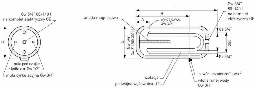 Wymienniki wyposażone w podwójna wężownicę typu "U", mufę cyrkulacyjną i mufę pod czujkę z kotła centralnego ogrzewania. Ocieplone są czarną pianką poliuretanową i współpracują ze wszystkimi typami kotłów - olejowymi, gazowymi, węglowymi itd. Długą żywotność urządzeń zapewnia emalia ceramiczna EXTRA GLASS, która stanowi zabezpieczenie przed korozją.