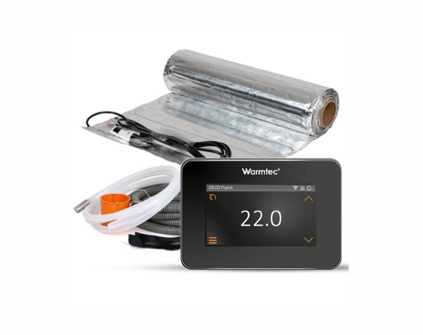 Pełen zestaw elektrycznego ogrzewania podłogowego pod panele Warmtec. Zawiera programowalny regulator temperatury z czytelnym wyświetlaczem LCD i funkcją Wi-Fi, jednostronnie zasilaną matę grzejną oraz przydatne akcesoria ułatwiające montaż.