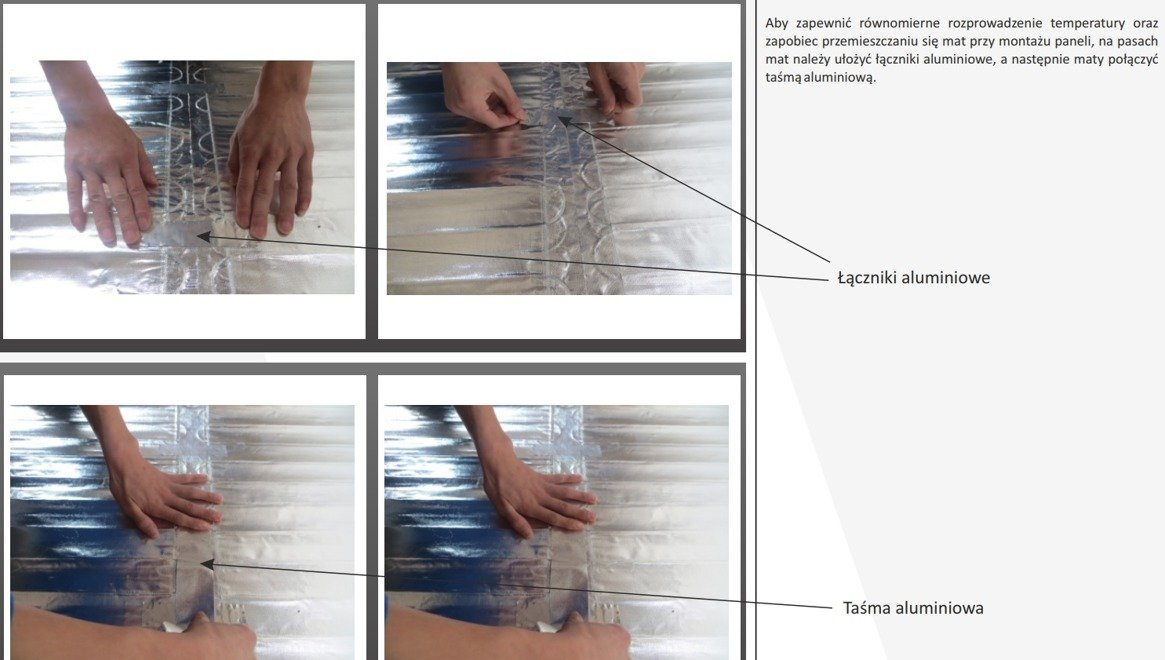 Aby zapewnić równomierne rozprowadzenie temperatury i zapobiec przemieszczaniu się mat przy montażu paneli, na pasach mat należy ułożyć łączniki aluminiowe, a następnie maty połączyć taśmą aluminiową.
